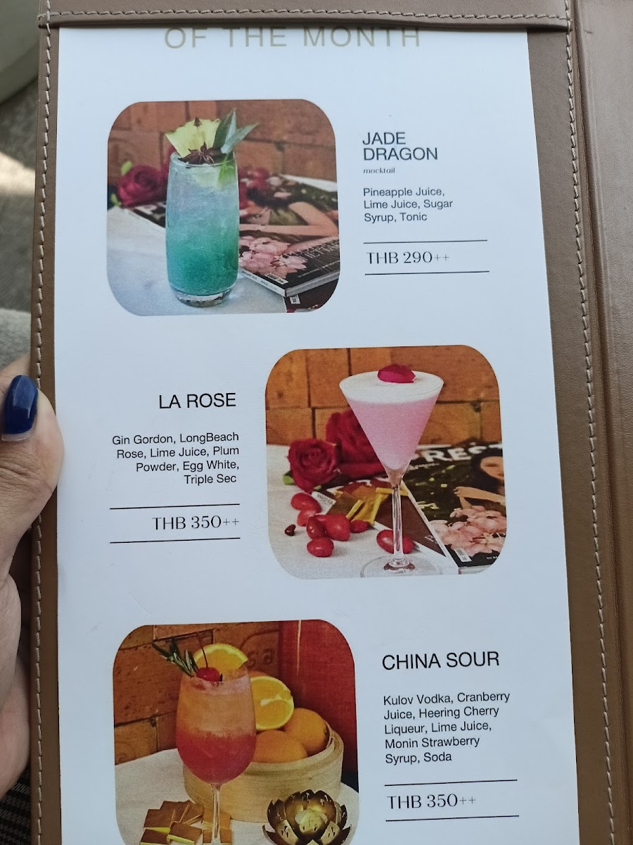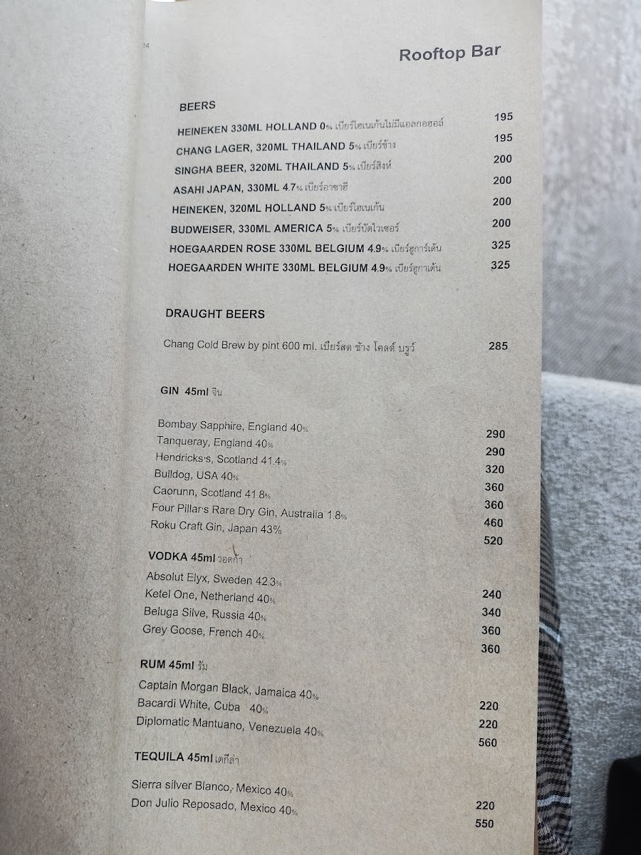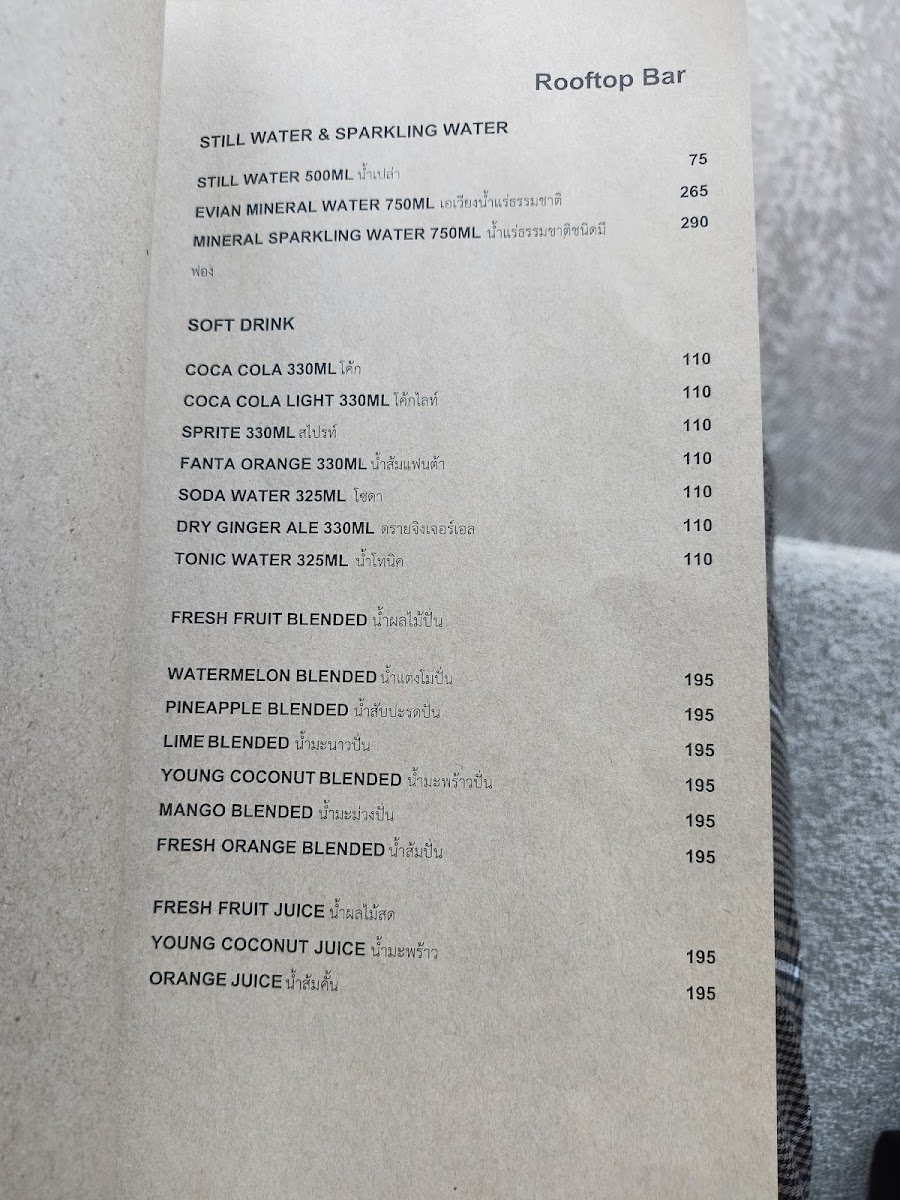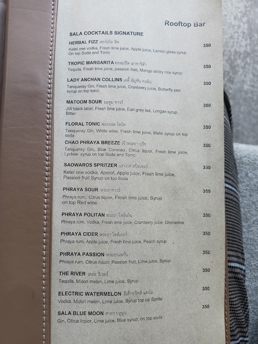 The menu features a variety of Thai and international dishes alongside a selection of beverages suitable for different times of the day, including coffee breaks and casual dining. Food options include traditional Thai favorites such as Pad Thai with Shrimp, river prawns, and local specialties like น้ําพริกลงเรือ and แกงส้มปลาสลิดโบราณ. In addition, there are western-style dishes including Carbonara, spaghetti ขี้เมา seafood, herb roasted salmon, and deep fried items. Light meals such as salads and stir-fried dishes like ไก่ผัดเม็ดมะม่วง are also available.